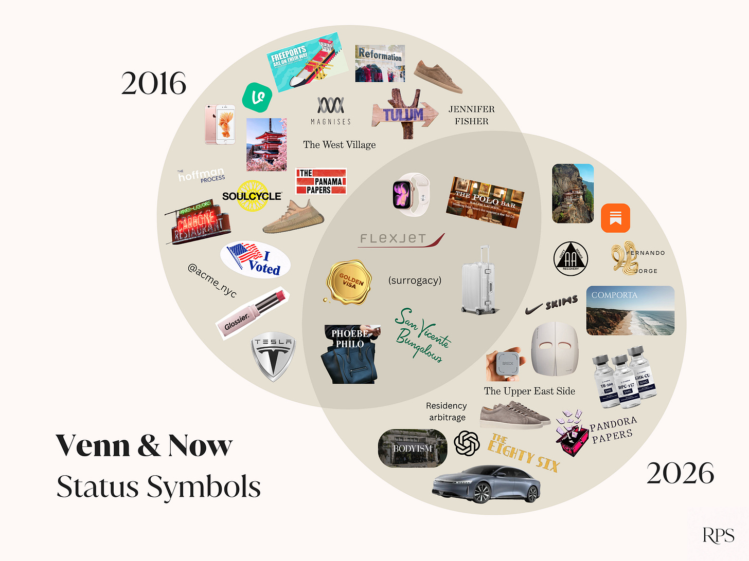 The New York Times capitalized on a trend you’ve probably been seeing all over your social media feeds: a quiet drift back to 2016, when things felt lighter and optimism still felt intact. I did a RPS version for you (a riff on a series I developed earlier in my career called Venn & Now) looking at status symbols and which ones actually endured. Big thanks to everyone who weighed in on this one. What do you think? I would love to hear your thoughts in the comments.